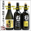 茨城県特産品の原材料で造る、栗焼酎、そば焼酎、芋焼酎の3本セットです。有料で3本箱入れもできます。